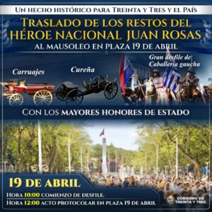 Se realizará el traslado de los restos de Juan Rosas, uno de los héroes de los Treinta y Tres orientales desde el batallón número 10 hasta el mausoleo del monumento en plaza 19 de abril. Será la segunda vez que en nuestro país ocurre un traslado de ésta magnitud, siendo con los mayores honores de estado de acuerdo al protocolo existente. La urna será llevada en cureña, con guardia de honor del cuerpo de blandengues a caballo, y luego un …