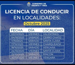 Calendario de trámite de licencia de conducir para el mes de octubre en el interior del departamento. 26 de septiembre de 2025