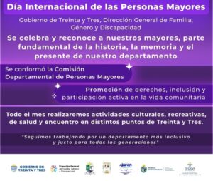 Gobierno de Treinta y Tres anunció a través de la Dirección General de Familia, Género y Discapacidad calendario de actividades para el mes de Octubre por el día Internacional de las Personas Mayores.